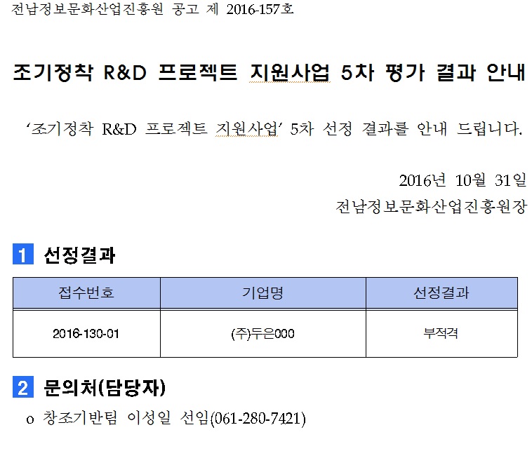 조기정착 R&D 프로젝트 지원사업 5차 평가 결과 안내