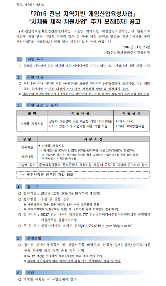 2016 전남지역기반 게임산업육성사업 시제품 제작 지원사업 추가 모집(5차) 공고