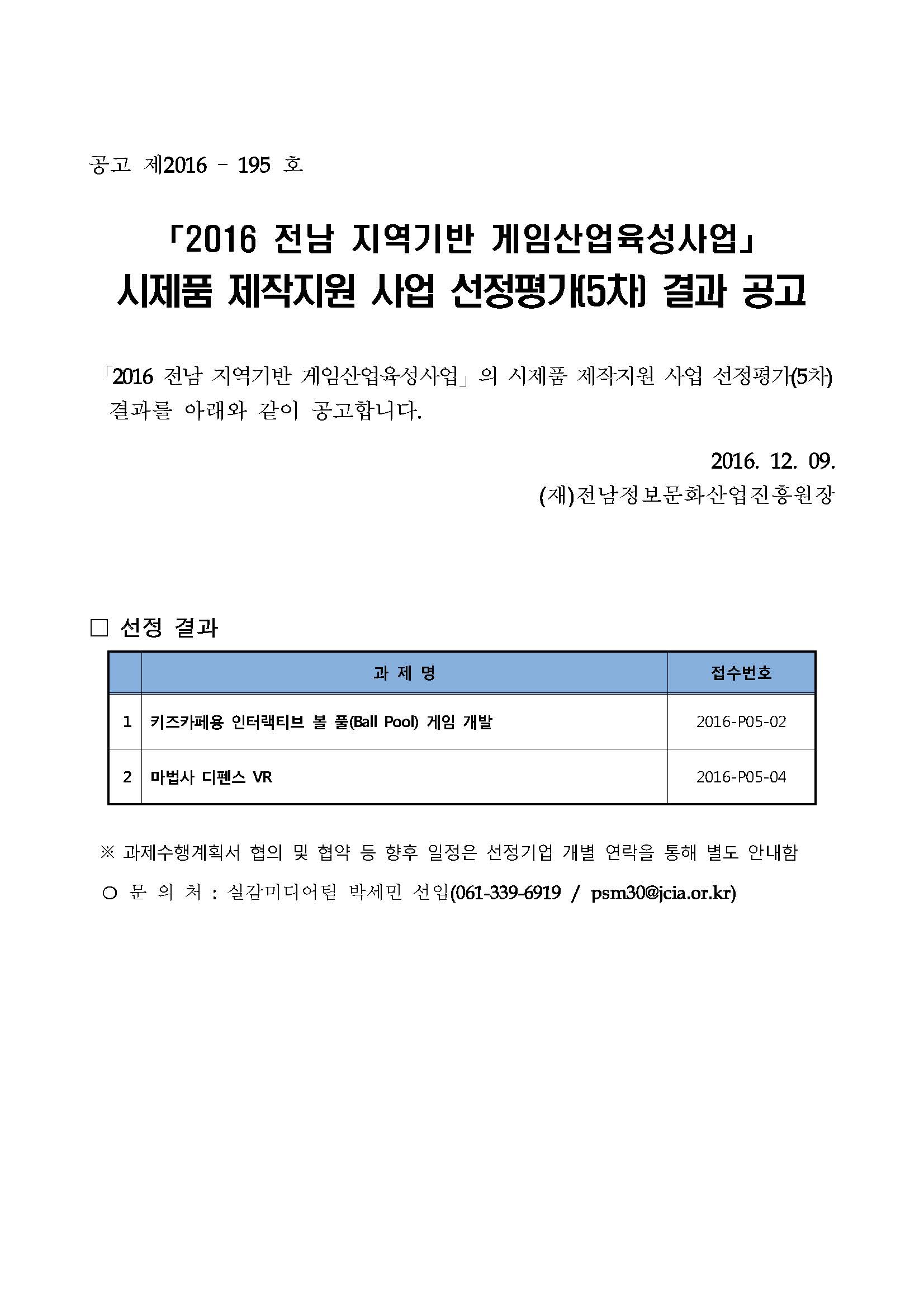 2016 전남 지역기반 게임산업육성사업 체감형 게임 시제품 제작 지원사업 선정평가(5차) 결과 공고