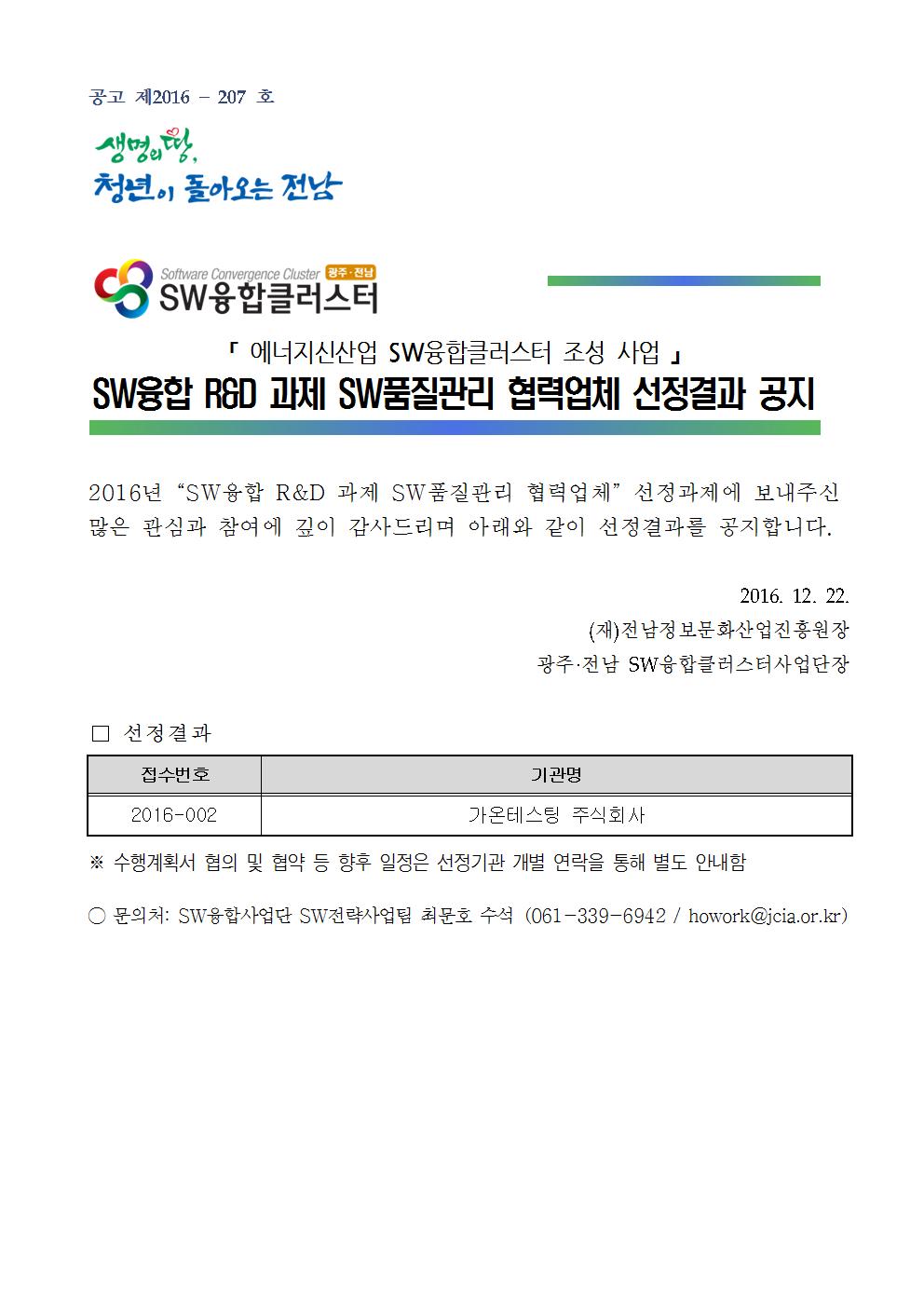 SW융합 R&D 과제 SW품질관리 협력업체 선정결과 공지
