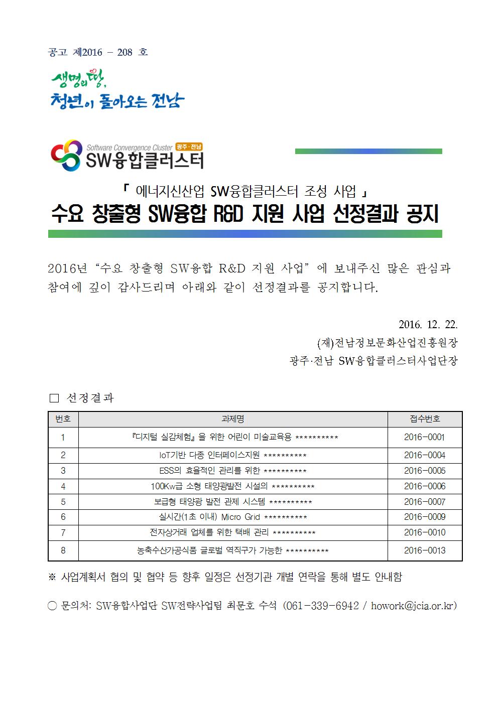 수요 창출형 SW융합 R&D 지원 사업 선정결과 공지