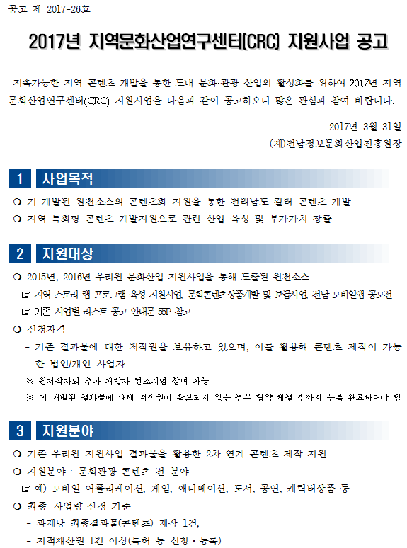 2017 지역문화산업연구센터(CRC) 지원사업 공고