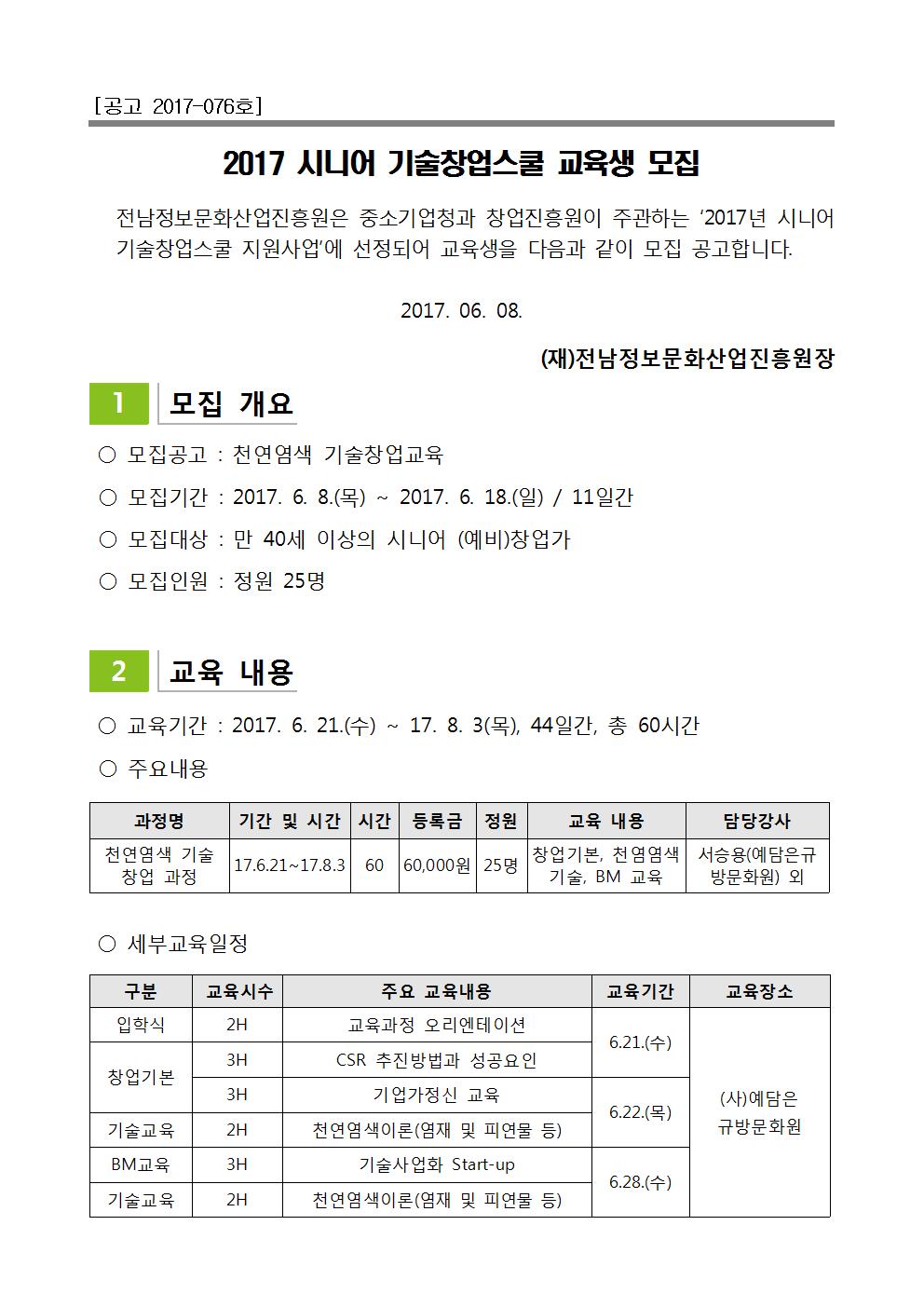 2017 시니어 기술창업스쿨 교육생 모집 안내