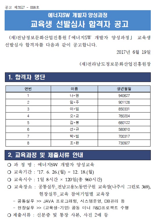 에너지SW 개발자 양성과정 교육생 선발심사 합격자 공고