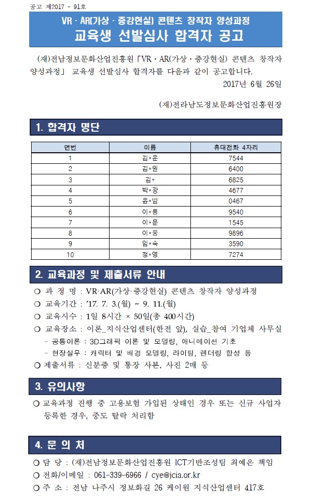 연락처 : <061-339-6903>, <ogm@jcia.or.kr>, 팩스 : <061-331-5004>