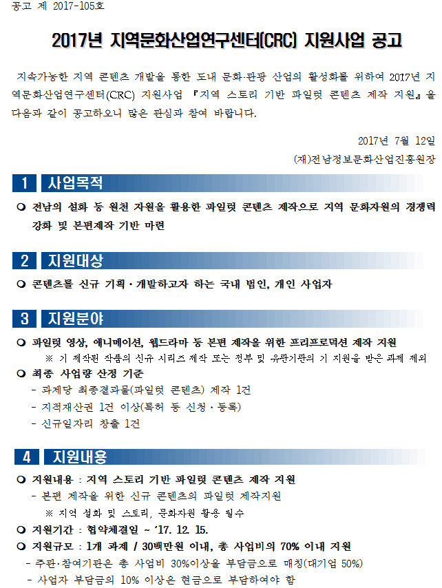 2017년 지역문화산업연구센터(CRC) 지원사업 공고 『지역 스토리 기반 파일럿 콘텐츠 제작 지원』