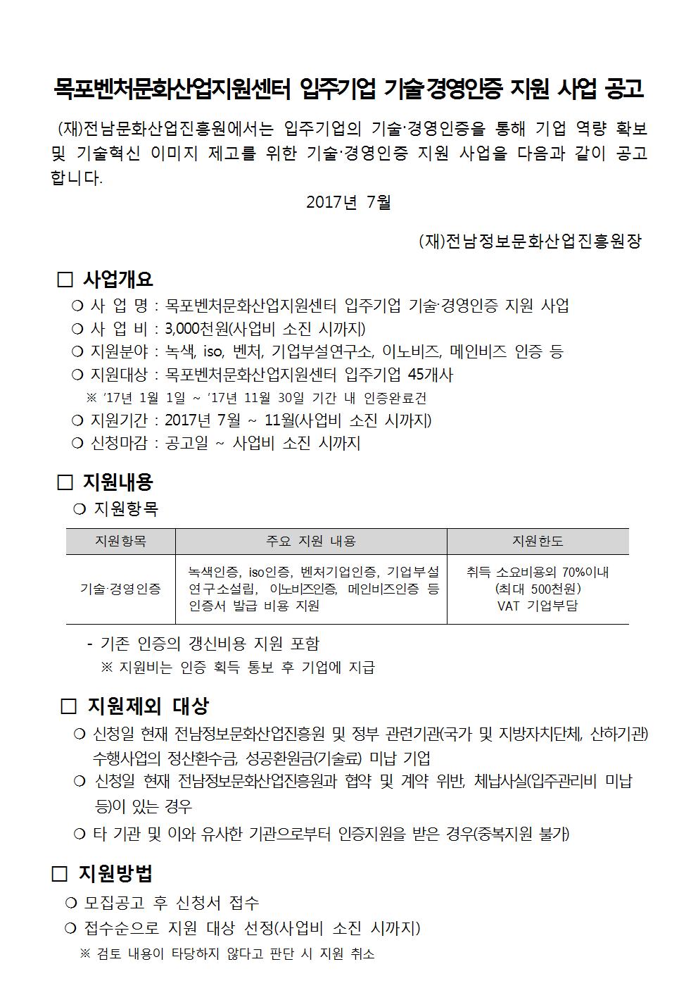 2017-107호 목포벤처문화산업지원센터 입주기업 기술경영인증 지원 사업 공고