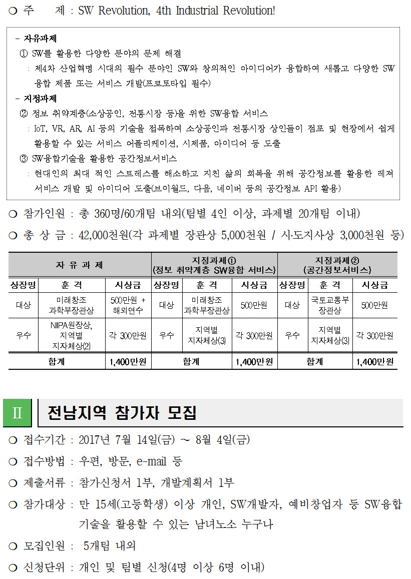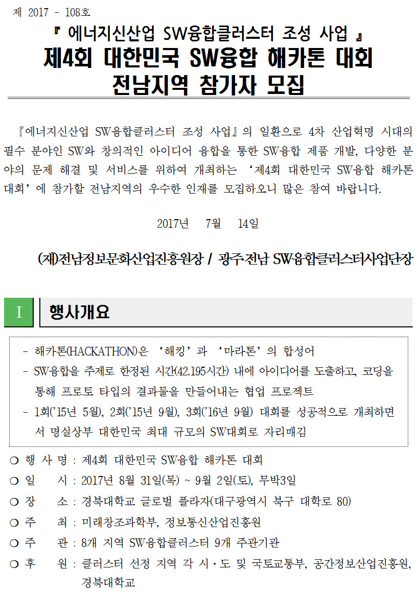 [2017-108호] 제4회 대한민국 SW융합 해카톤 대회 전남지역 참가자 모집