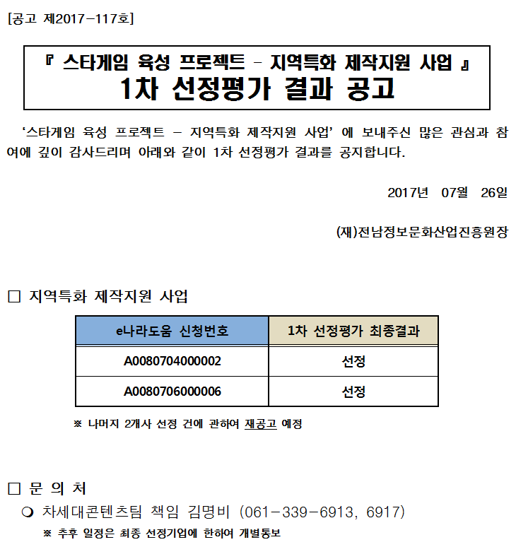 | 다음글 | 시장진출 제작지원 사업 - 발표평가(최종선정) 결과 공고 |