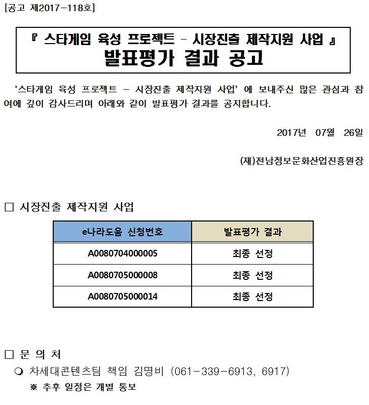 시장진출 제작지원 사업 - 발표평가(최종선정) 결과 공고