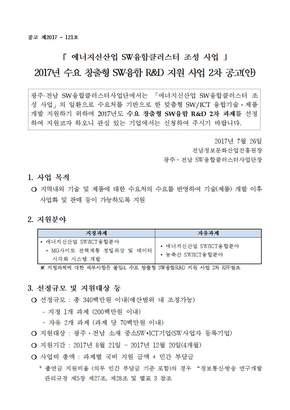 「 에너지신산업 SW융합클러스터 조성 사업 」2017년 수요 창출형 SW융합 R&D 지원 사업 2차 공고(안)