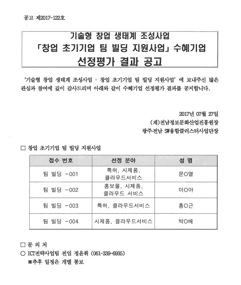 기술형 창업 생태계 조성사업 「창업 초기기업 팀 빌딩 지원사업」 수혜기업 선정평가 결과 공고