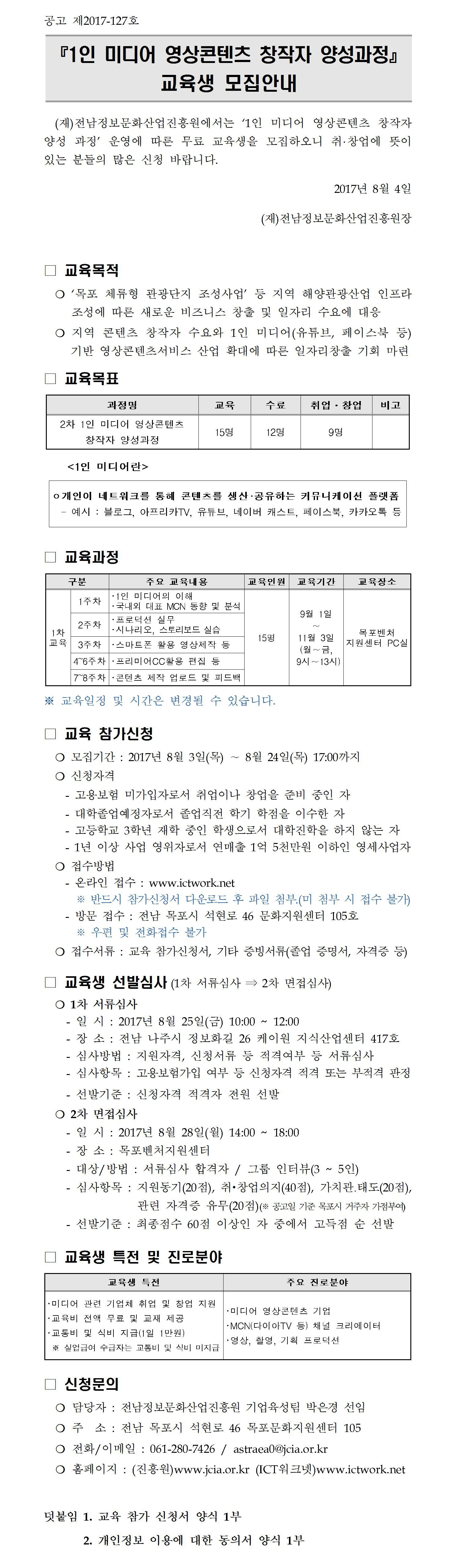 『1인 미디어 영상콘텐츠 창작자 양성과정』교육생 모집 공고