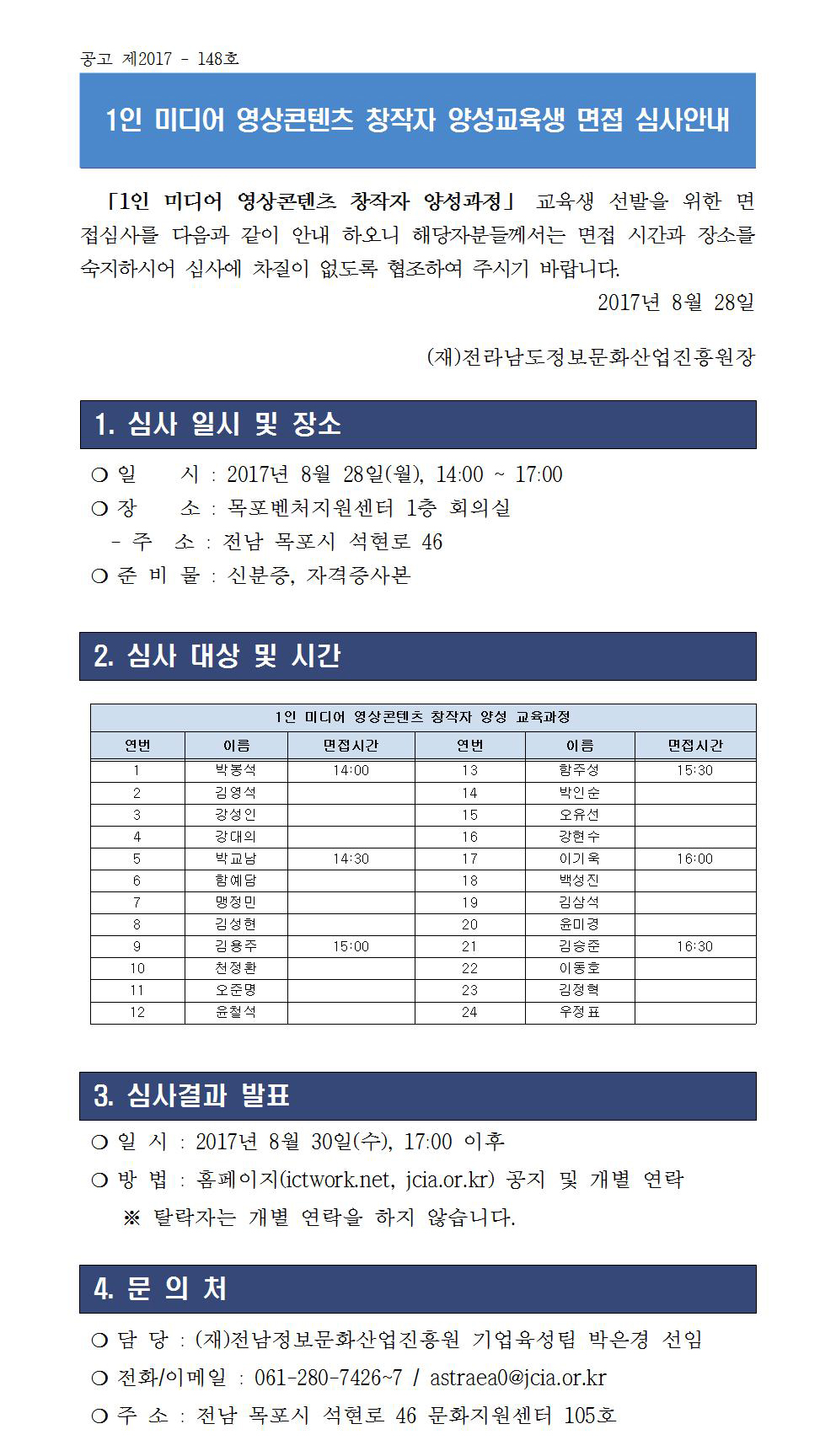 연락처 : <061-339-6903>, <ogm@jcia.or.kr>, 팩스 : <061-331-5004>