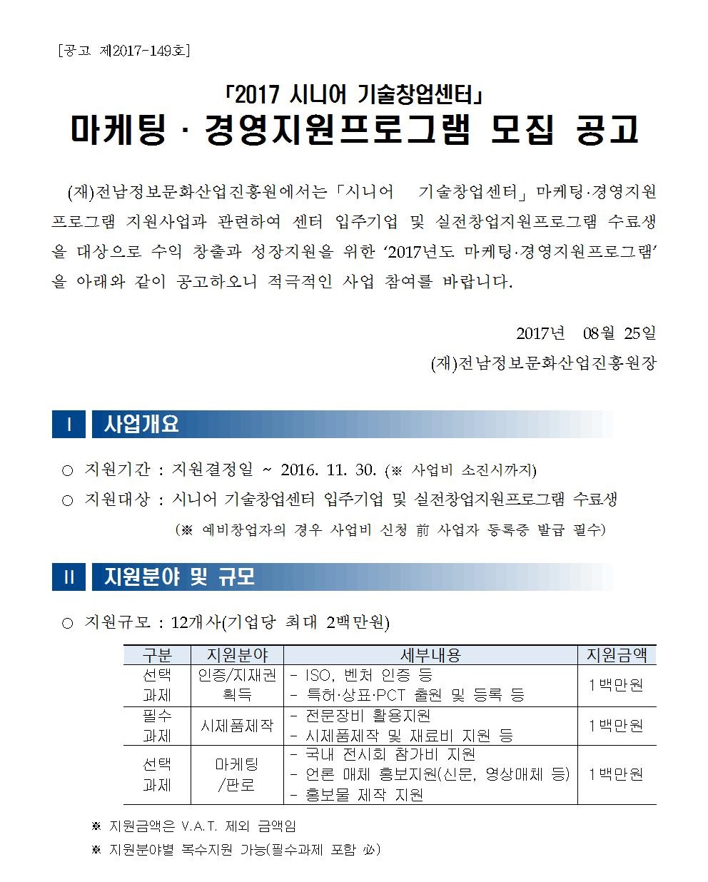 「2017 시니어 기술창업센터」마케팅·경영지원프로그램 모집 공고
