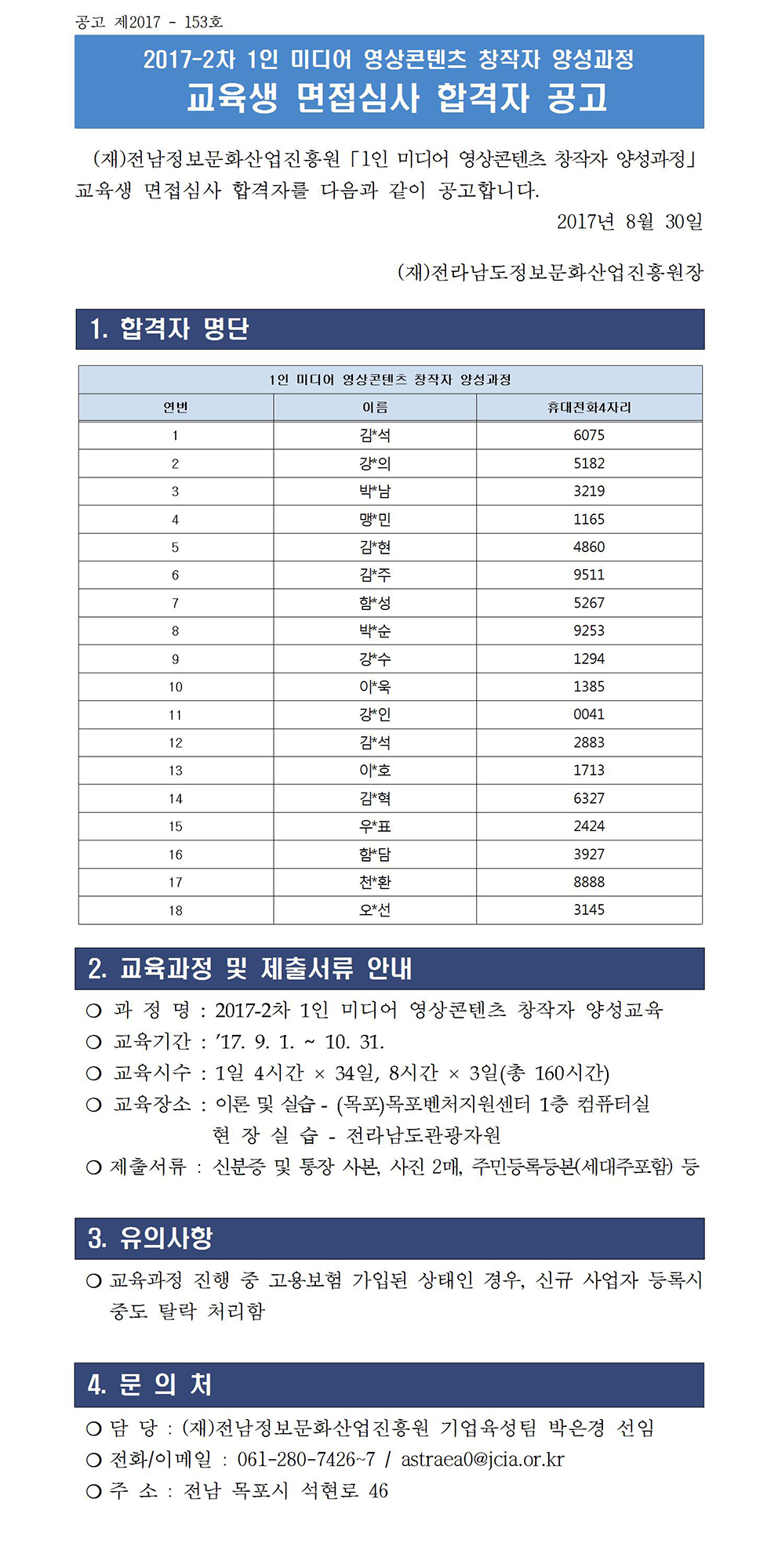 2017-2차 1인 미디어 영상콘텐츠 창작자 양성과정 교육생 면접심사 합격자 공고