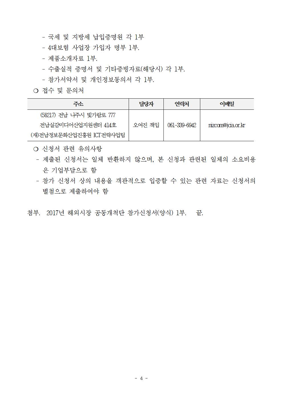 연락처 : <061-339-6903>, <ogm@jcia.or.kr>, 팩스 : <061-331-5004>