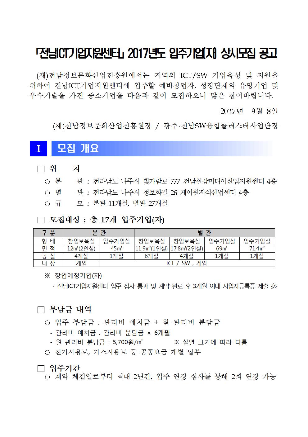 「전남ICT기업지원센터」2017년도 입주기업(자) 상시모집 공고
