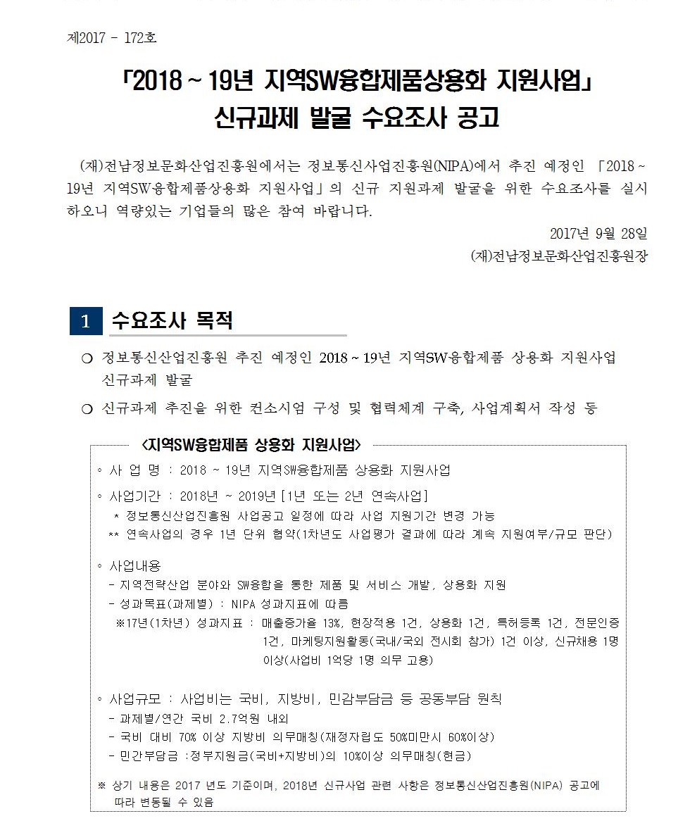 2018 ~ 19년 지역SW융합제품 상용화지원사업 신규과제 발굴 수요조사 공고