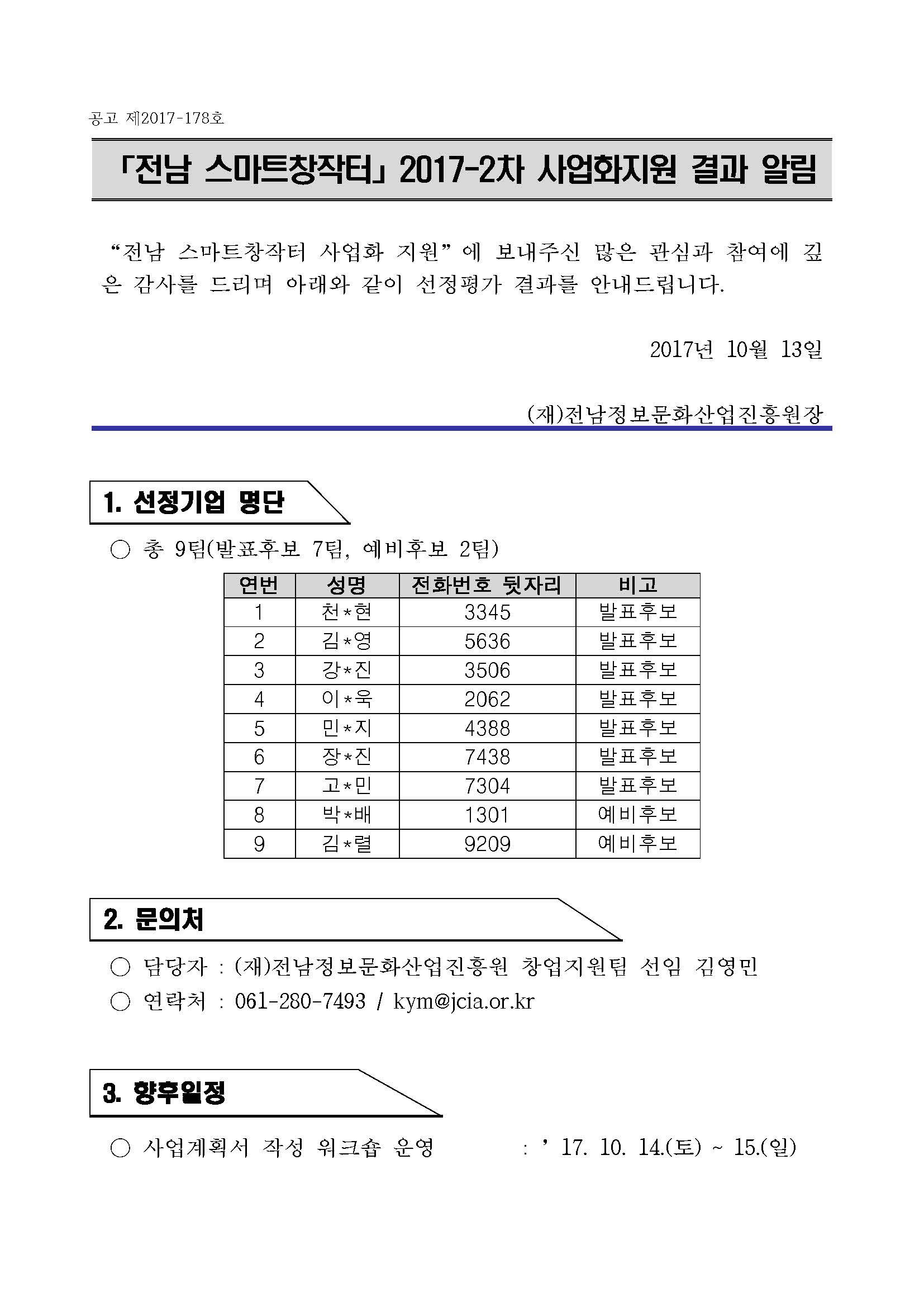 전남 스마트창작터 2017-2차 사업화지원 결과 알림