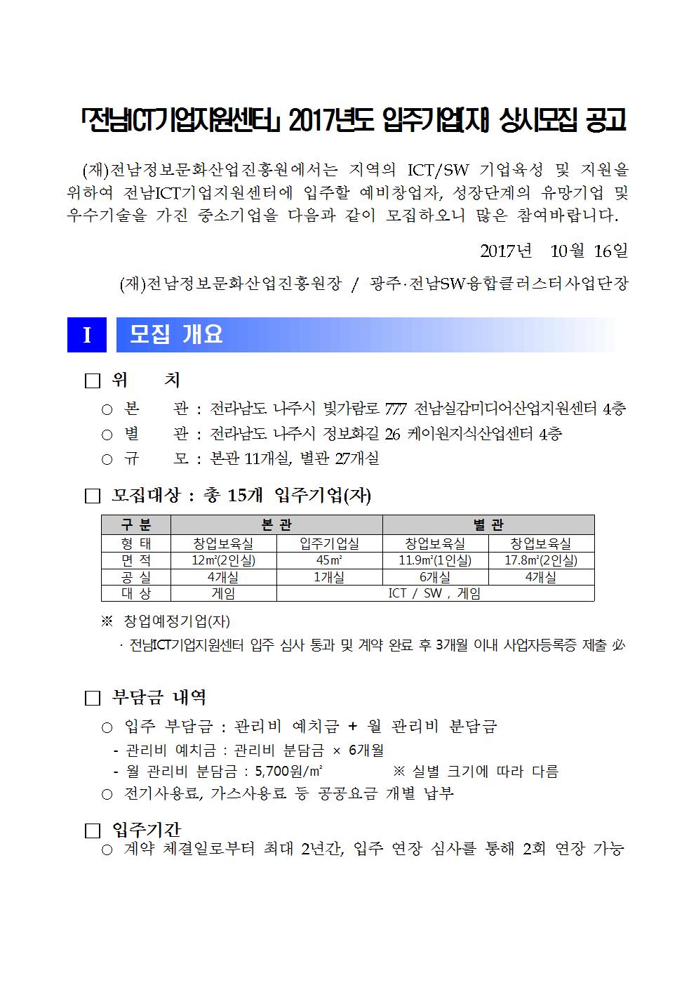 「전남ICT기업지원센터」2017년도 입주기업(자) 상시모집 공고(수정)
