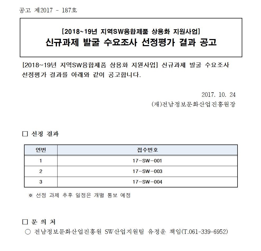 2018~19년 지역SW융합제품 상용화지원사업 신규과제 발굴 수요조사 선정평가 결과 공고