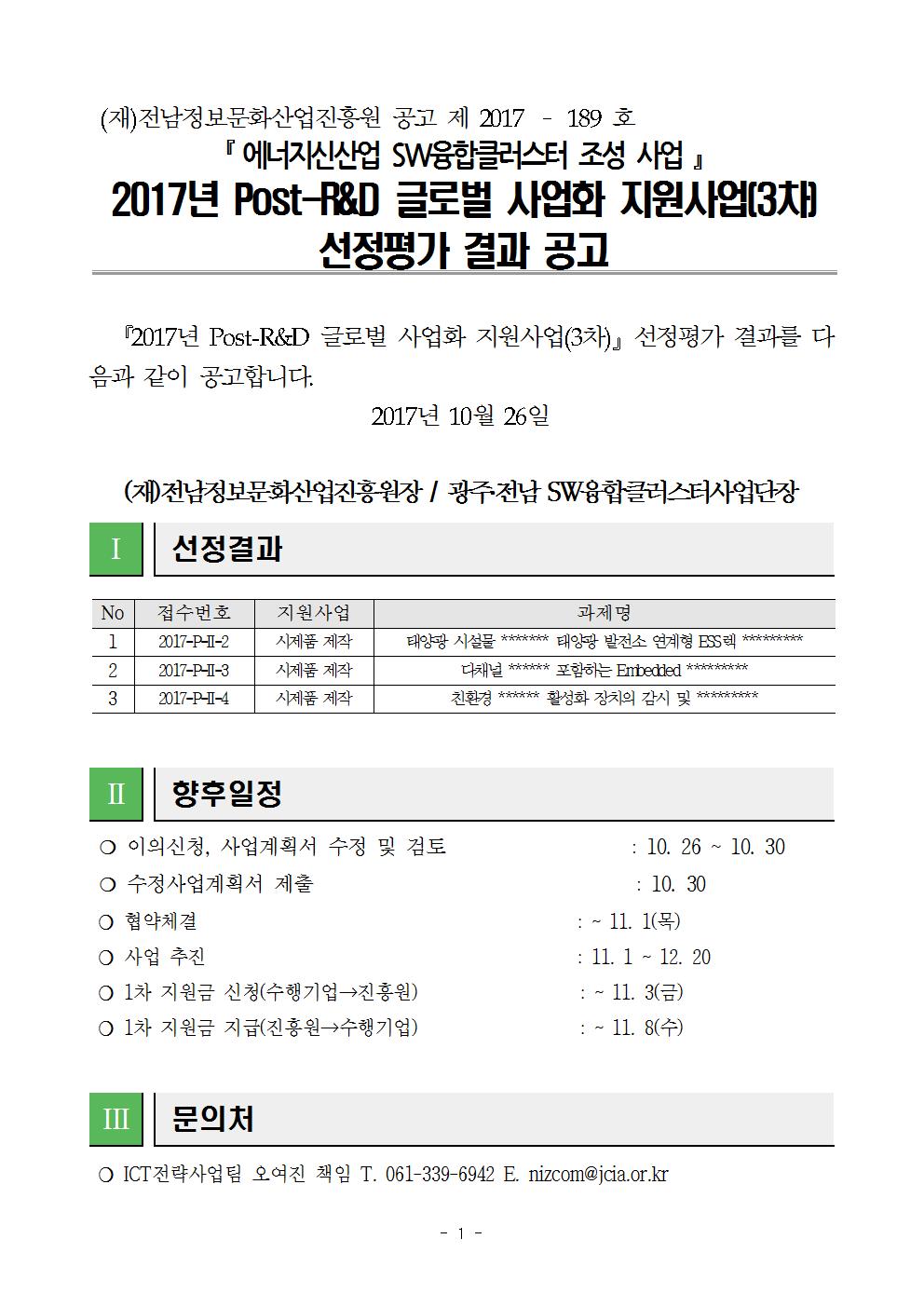 2017년 Post-R&D 글로벌 사업화 지원사업(3차) 선정평가 결과 공고