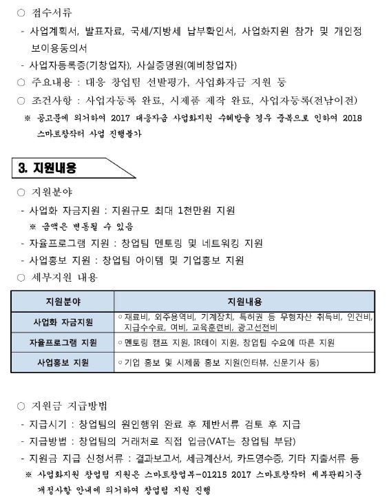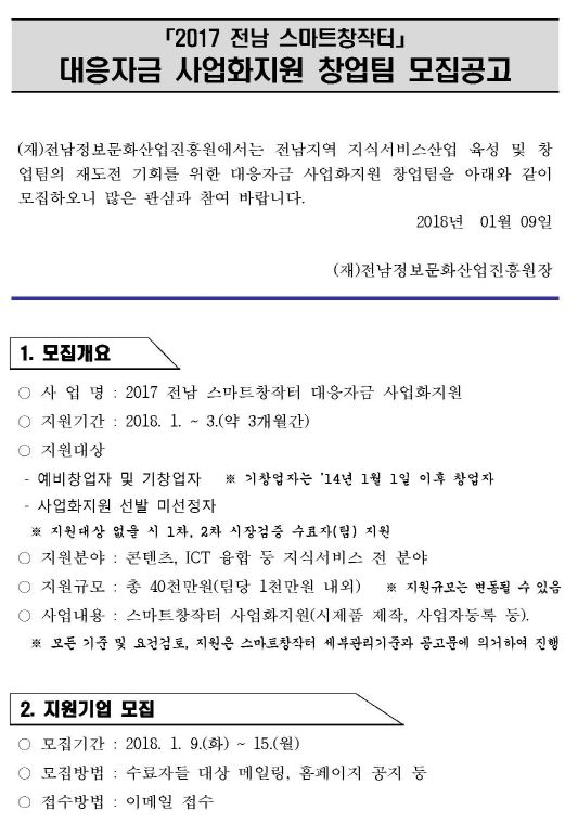 2017 전남 스마트창작터 대응자금 사업화지원 창업팀 모집공고