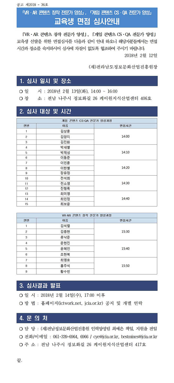「VR·AR 콘텐츠 창작 전문가 양성」, 「게임 콘텐츠 CS·QA 전문가 양성」교육생 면접 심사안내