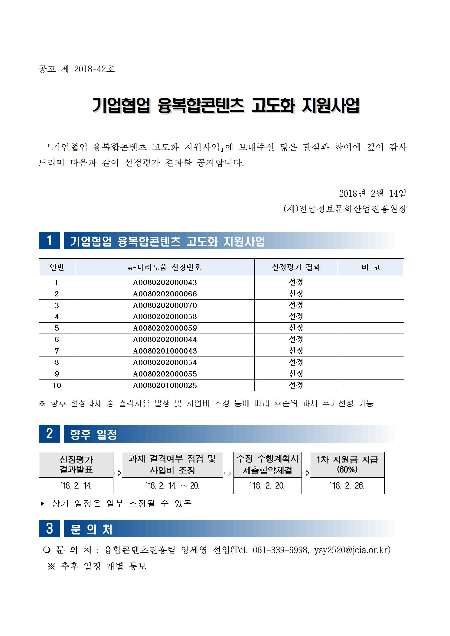 기업협업 융복합콘텐츠 고도화 지원사업 선정평가 결과공고