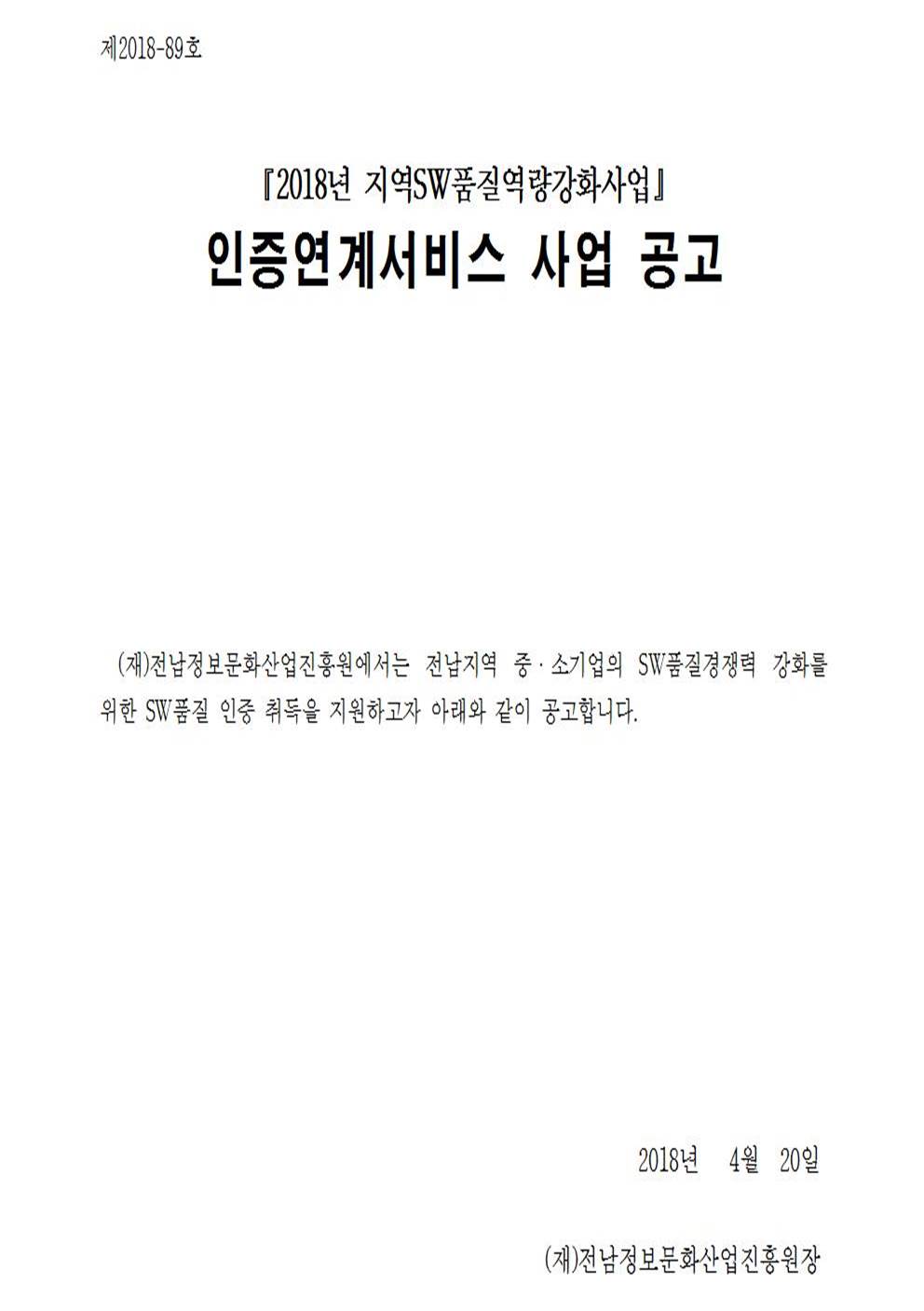 | 이전글 | 2018년 SW품질컨설팅 및 테스팅 지원사업 공고 |