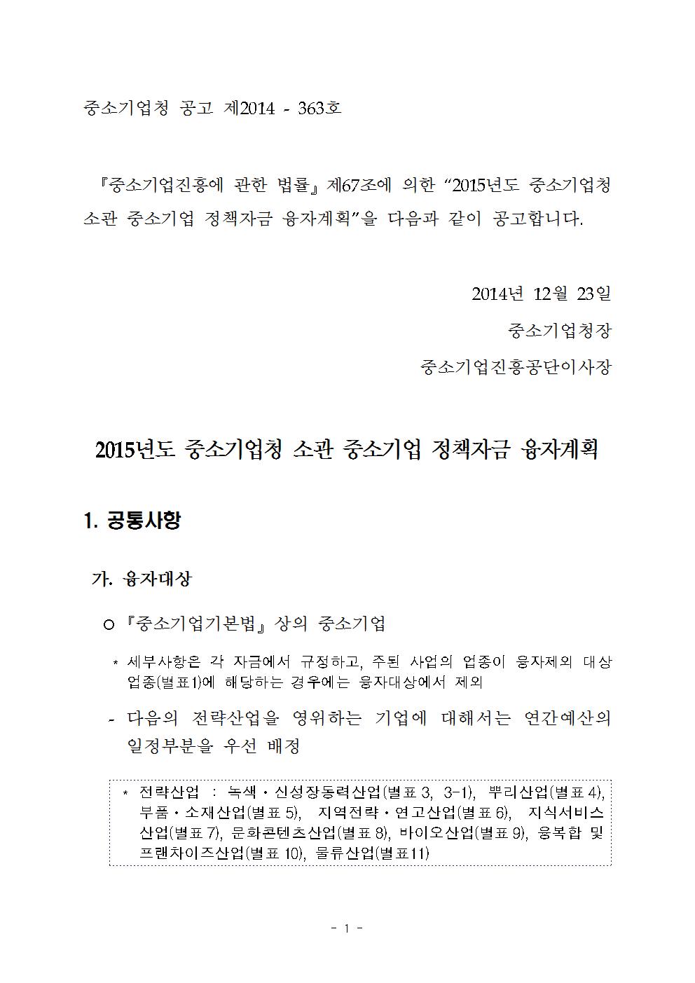[중소기업청] 2015년 중소기업 정책자금 융자계획 공고