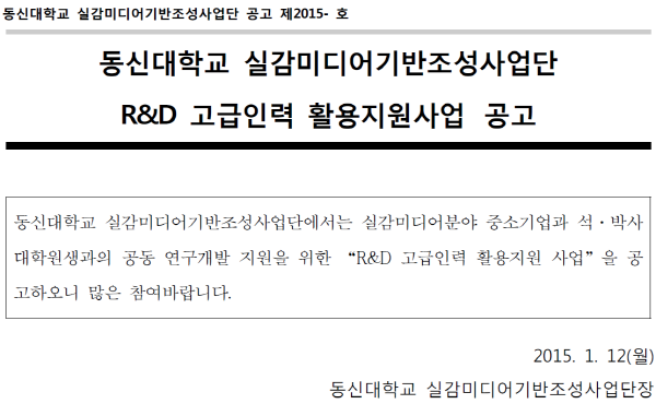 [동신대학교 실감미디어기반조성사업단] R&D고급인력 활용지원사업 공고