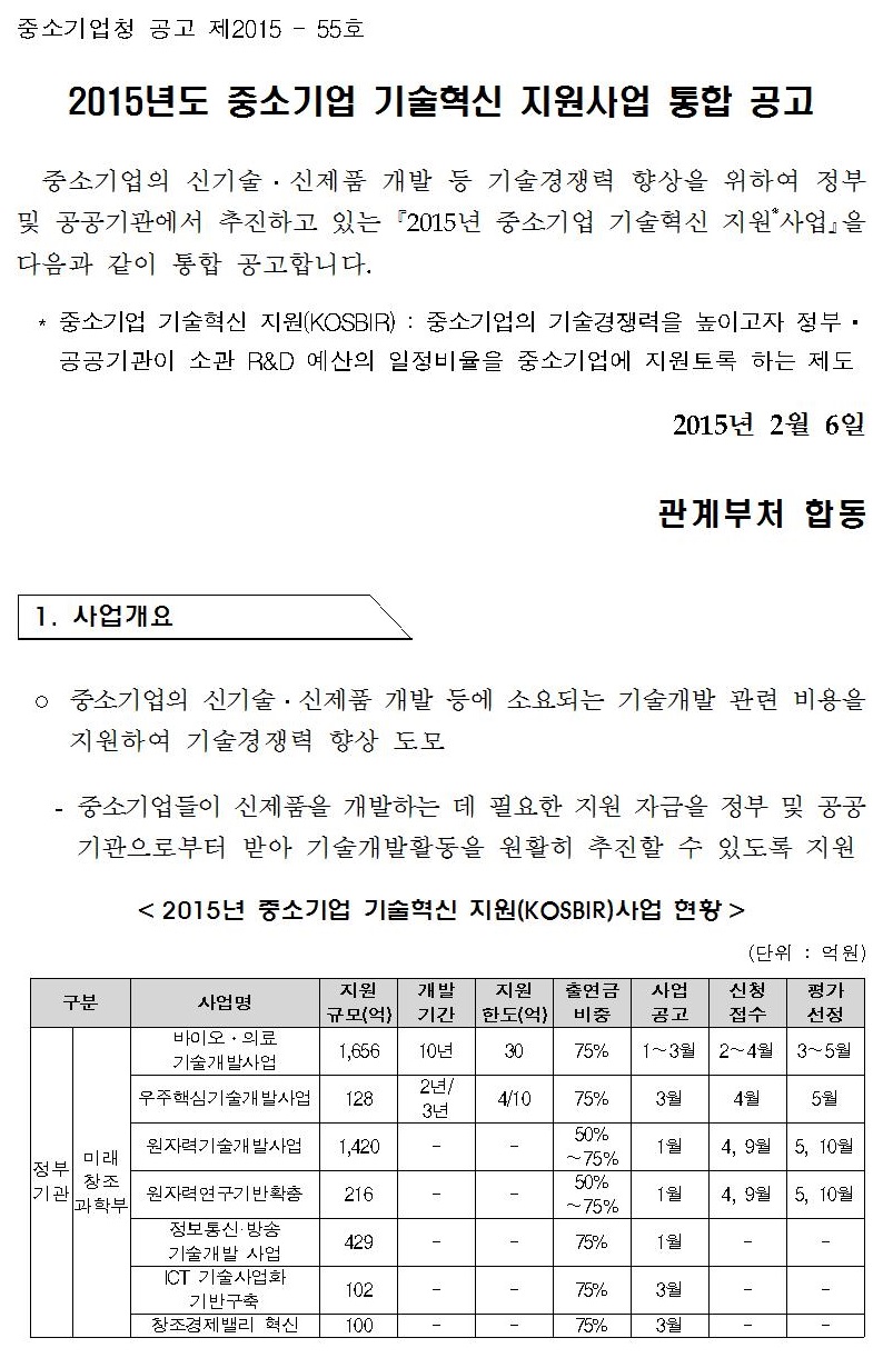 [중소기업청] 2015년도 중소기업 기술혁신 지원사업(KOSBIR) 통합 공고