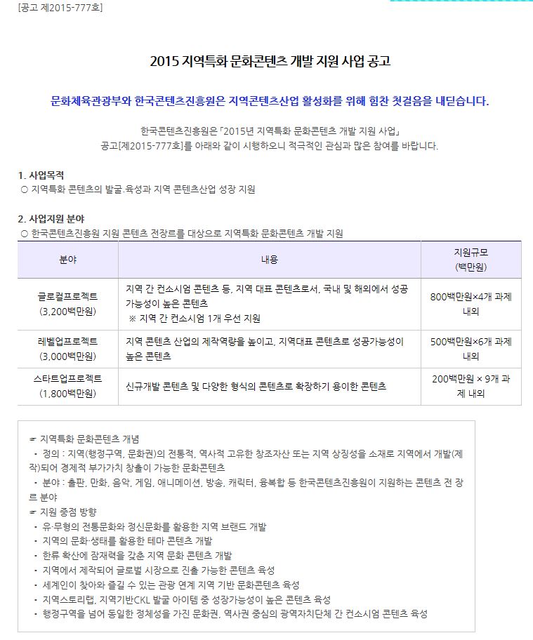 [한국콘텐츠진흥원] 2015 지역특화 문화콘텐츠 개발 지원 사업 공고