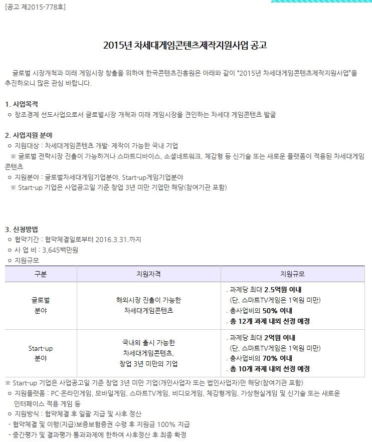 [한국콘텐츠진흥원] 2015년 차세대게임콘텐츠제작지원 공고