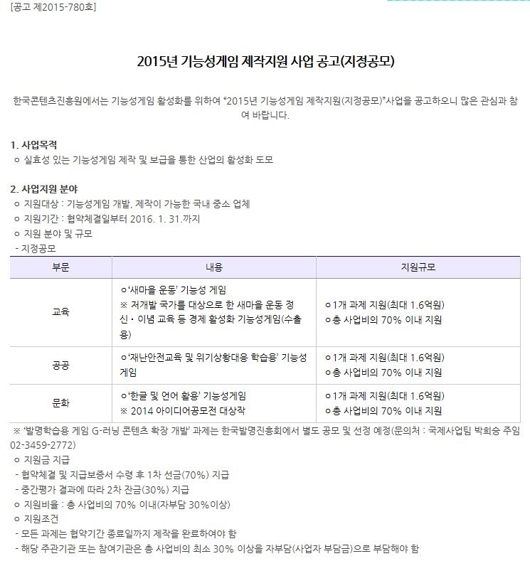 [한국콘텐츠진흥원] 2015년 기능성게임 제작지원 사업 공고(지정공모)