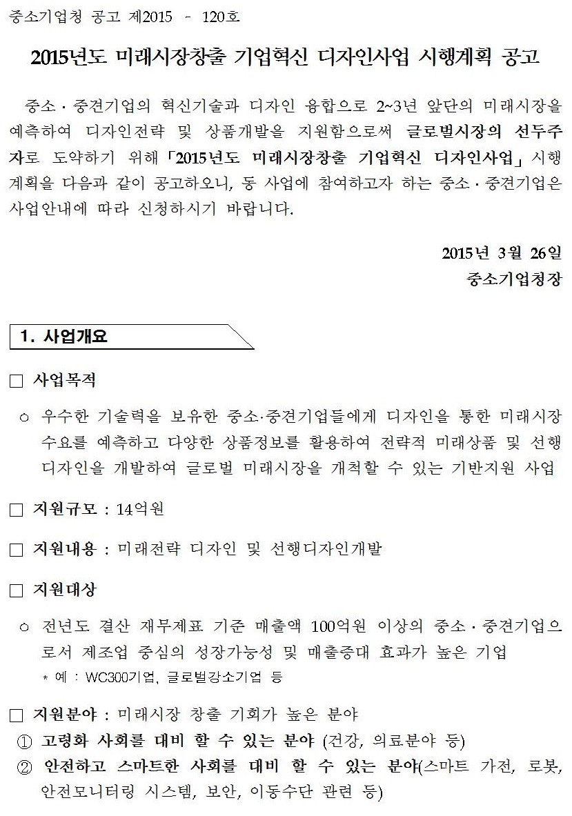 [중소기업청] 2015년도 미래시장창출 기업혁신 디자인사업 시행계획 공고