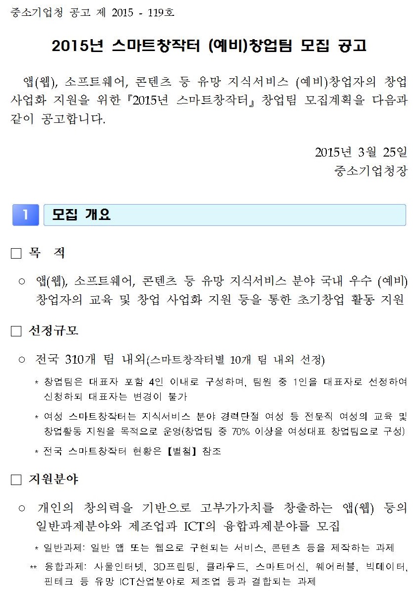[중소기업청] 2015년 스마트창작터 (예비)창업팀 모집 공고