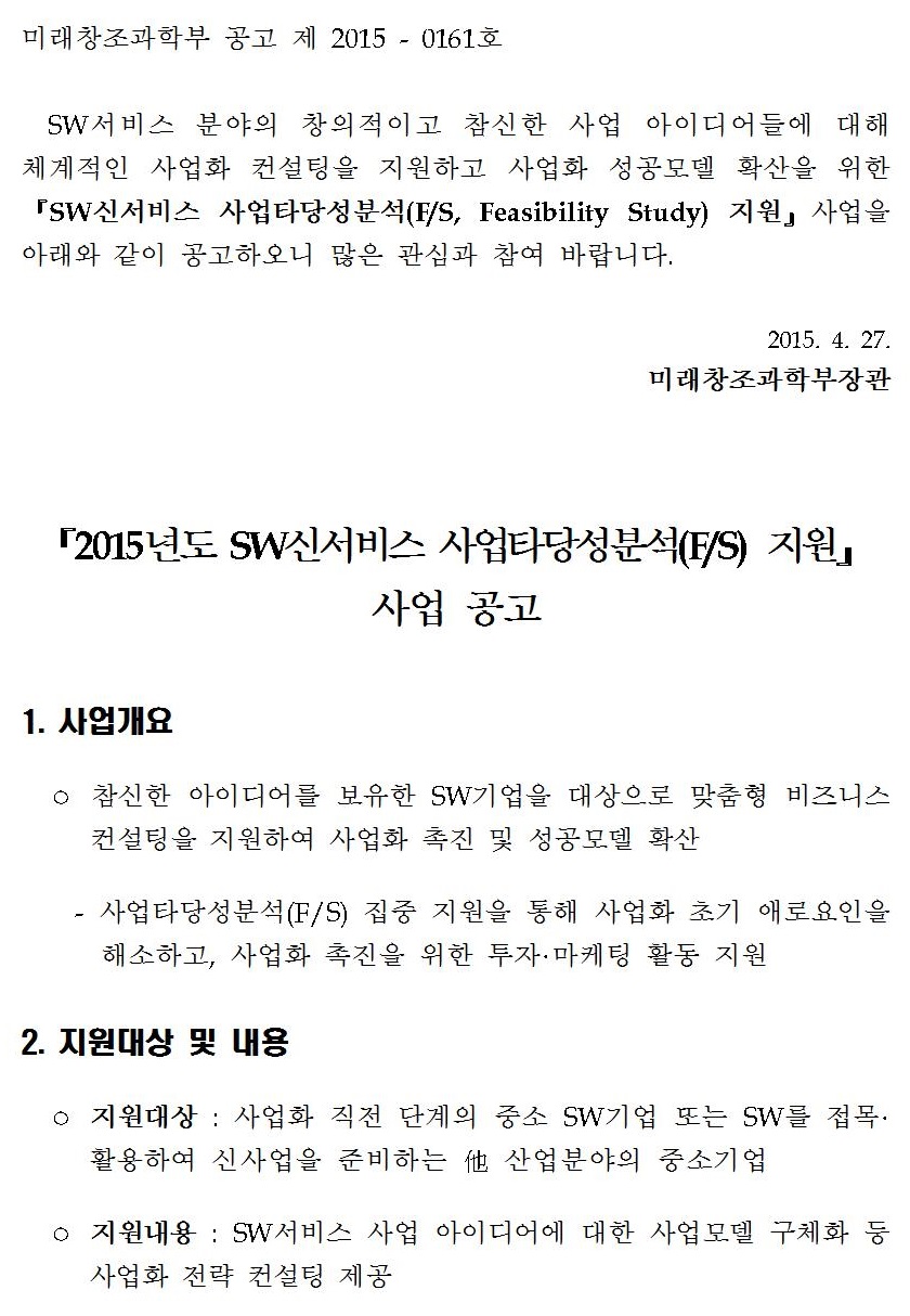 [미래창조과학부] 『2015년도 SW신서비스 사업타당성분석(F/S) 지원』사업공고