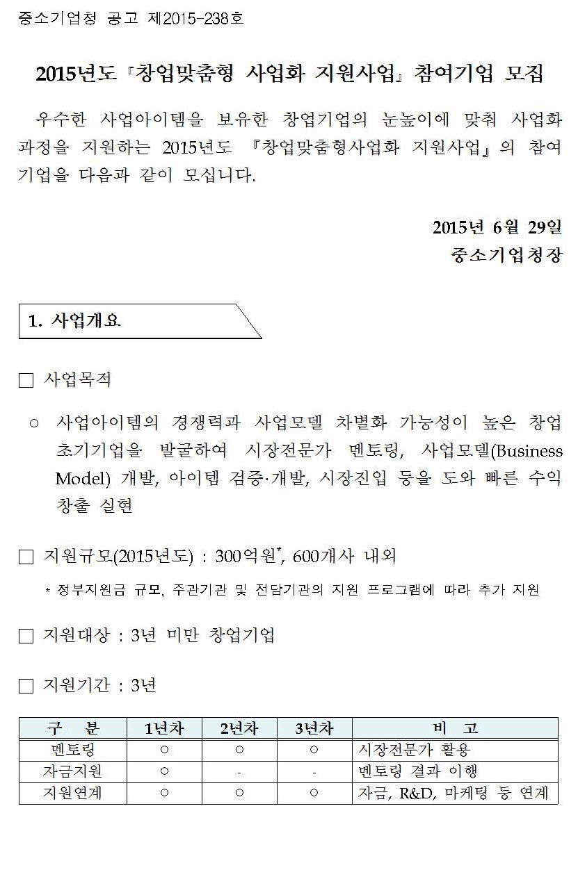 [창업진흥원] 2015년 창업맞춤형사업화 지원사업 창업기업 모집공고