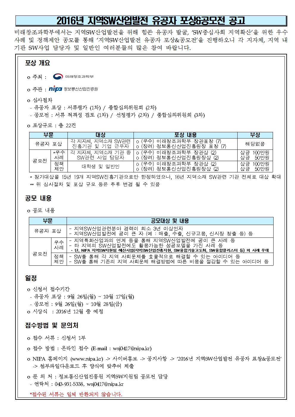 [미래창조과학부] 2016년 지역SW산업발전 유공자 포상&공모전 공고문