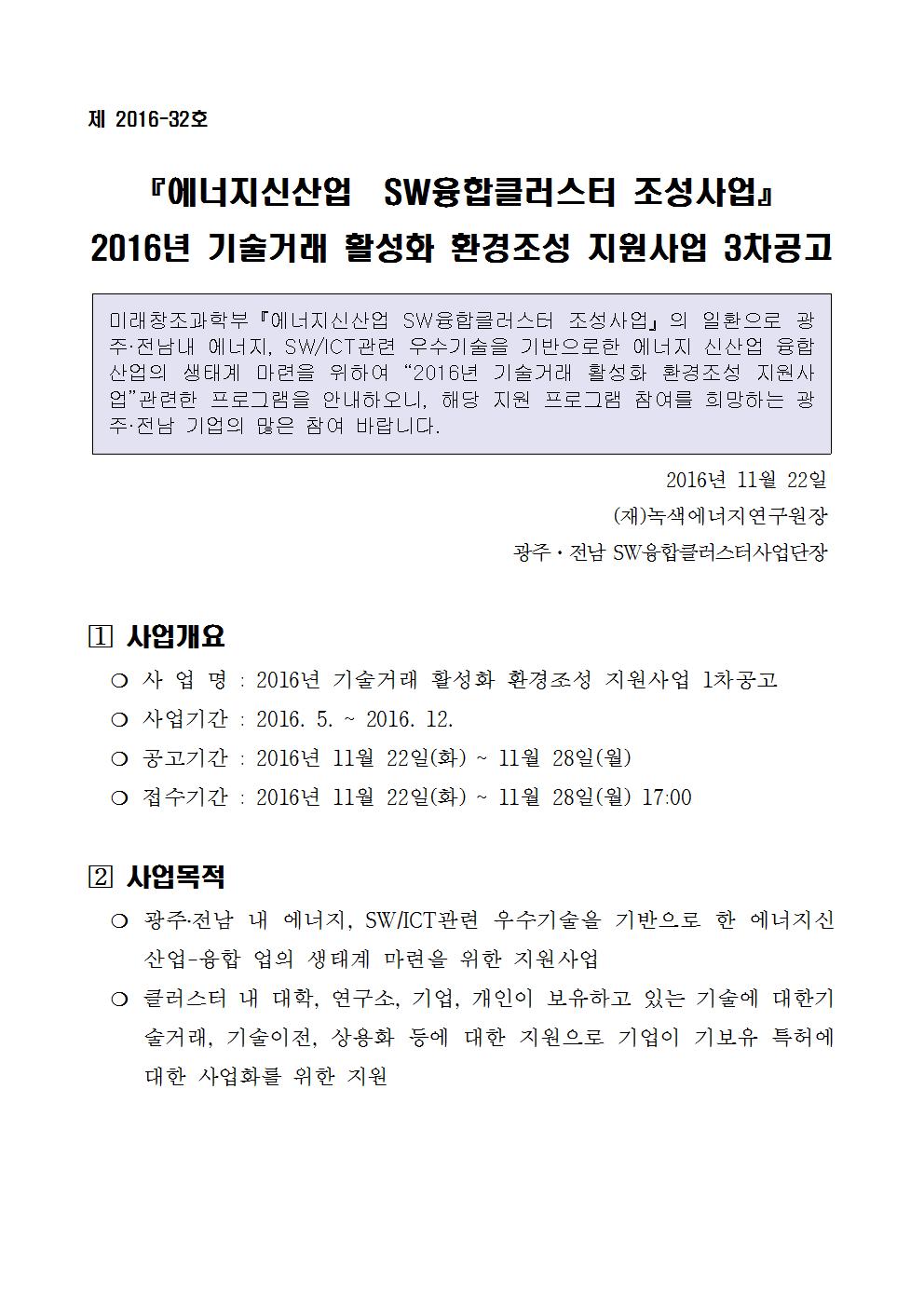 [녹색에너지연구원] SW융합클러스터 기술거래 활성화 환경조성 지원사업 3차 공고