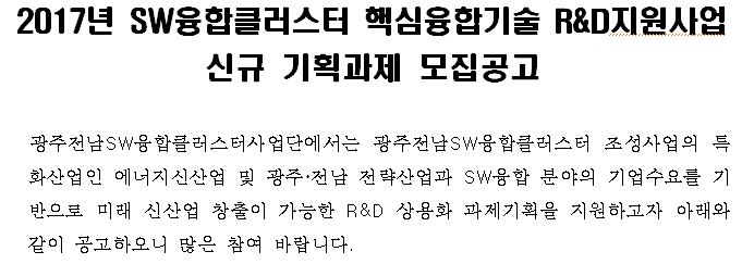 [ 광주정보문화산업진흥원] 제2017-156호 2017년 SW융합클러스터 핵심융합기술 R&D지원사업 신규 기획과제 모집공고