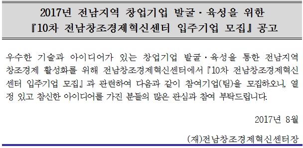 [전남창조경제혁신센터] 2017년 전남지역 창업기업 발굴·육성을 위한 10차 전남창조경제혁신센터 입주기업 모집 공고