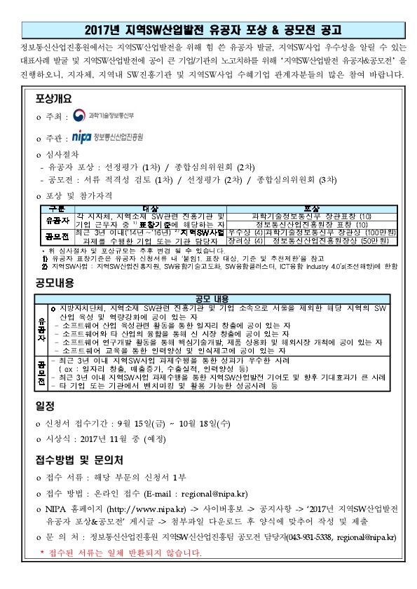 [정보통신산업진흥원] 2017년 지역SW산업발전 유공자 포상&공모전 공고