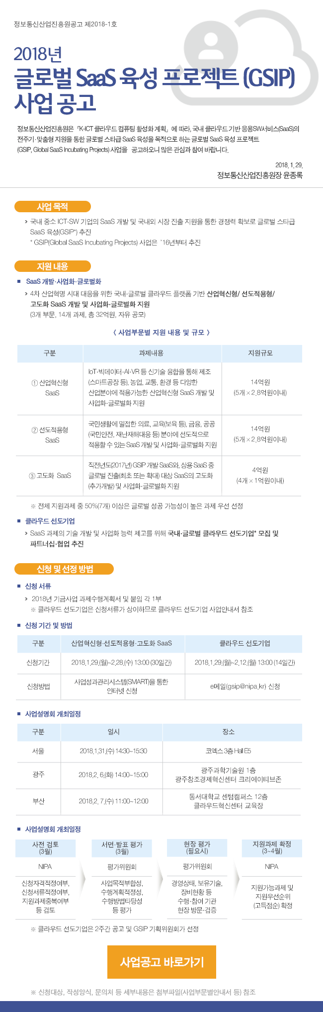 [정보통신산업진흥원]2018년 글로벌 SaaS 육성 프로젝트(GSIP) 사업 공고