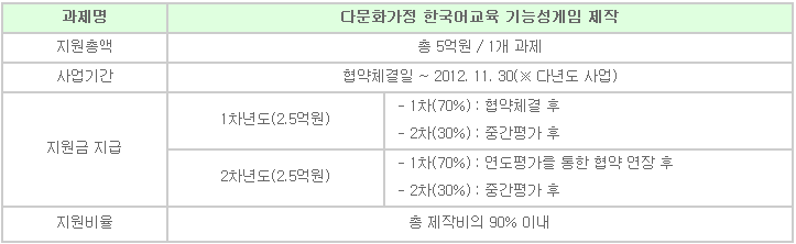 한국콘텐츠진흥원은 “2011년 기능성게임 제작지원(다문화가정 한국어교육)” 사업을 공고하오니 여러분의 많은 참여바랍니다.