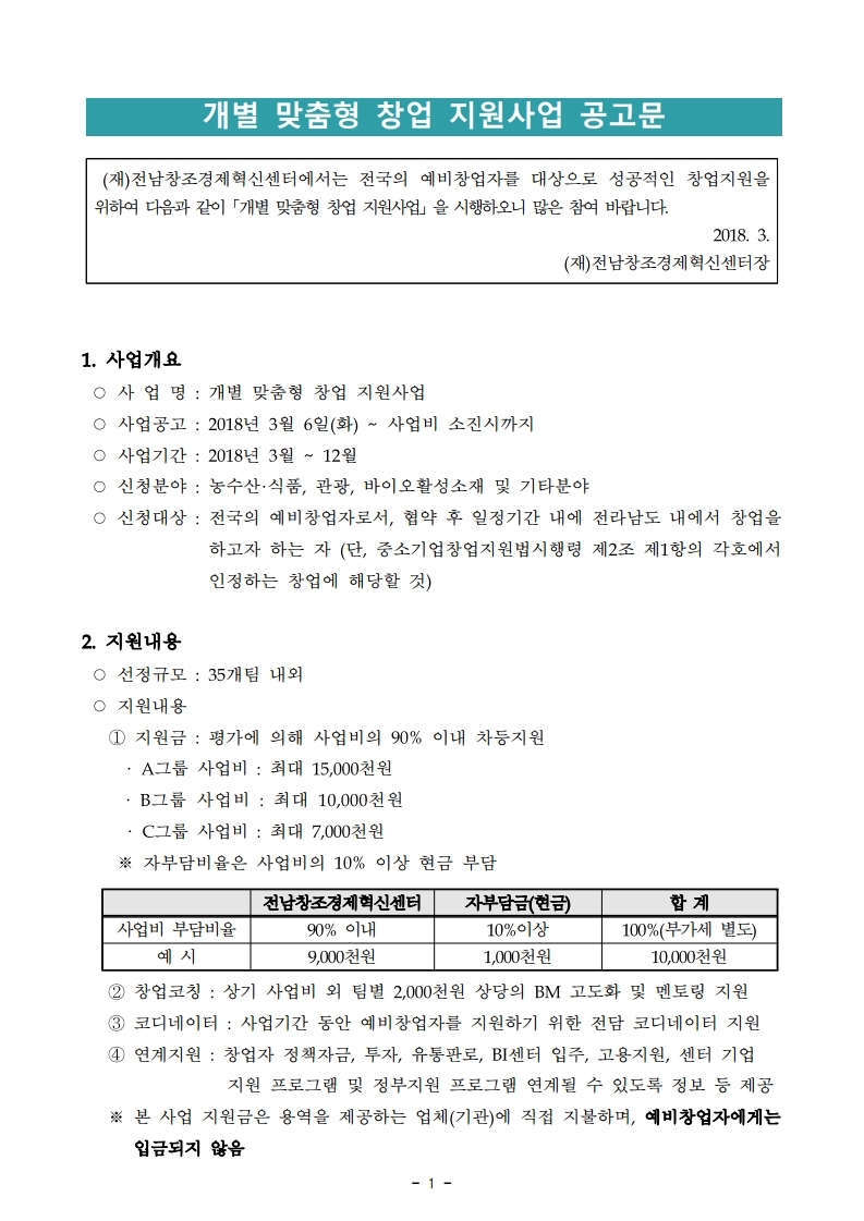 [전남창조경제혁신센터]2018년 개별맞춤형 창업지원사업 모집