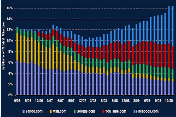 지난 2006년에는 야후나 MSN 사용 시간이 압도적으로 많았지만 지금은 페이스북과 유튜브에서 훨씬 많은 시간을 보내고 있는 것으로 나타났다. 야후, MSN,구글,유튜브,페이스북 등에서 보내는 시간을 분석한 결과 페이스북과 유튜브에서 보내는 시간이 많았다.
